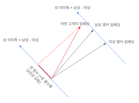 두 집단의 평균 임베딩 차이를 의미 축으로 정의한다.