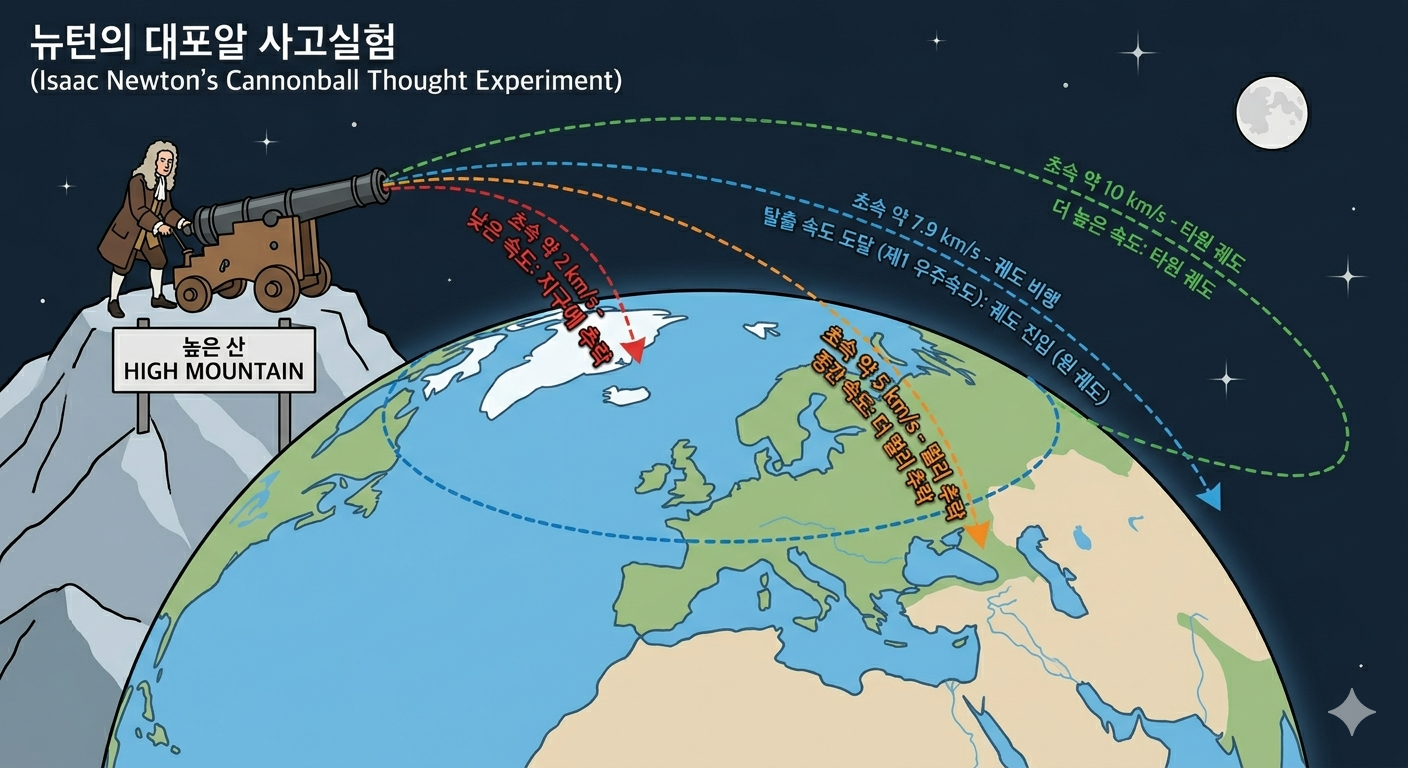 뉴턴은 대포알 사고실험을 통해 대포알의 속도에 따라 대포가 지구로 떨어지거나, 지구를 벗어날 수도 있다고 보았다. 그런데 특정 속도의 대포알은 지구로 떨어지거나 지구를 벗어나지도 않게 되는데 현재 달의 상태가 이 상태인 것이다.